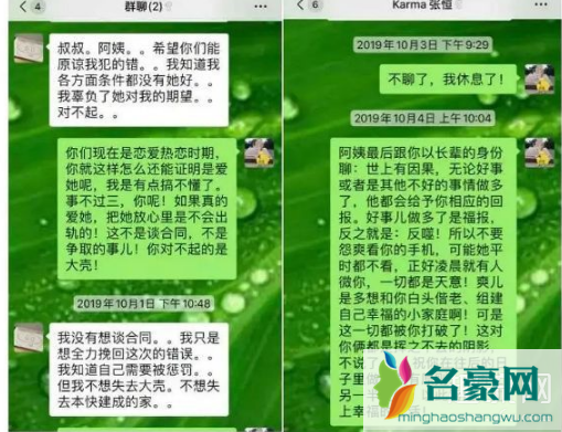 2019年9月份,郑爽和张恒感情破裂分手。据说原因是张恒出轨,这个聊天记录显示张恒在祈求郑家原谅他犯下的错误