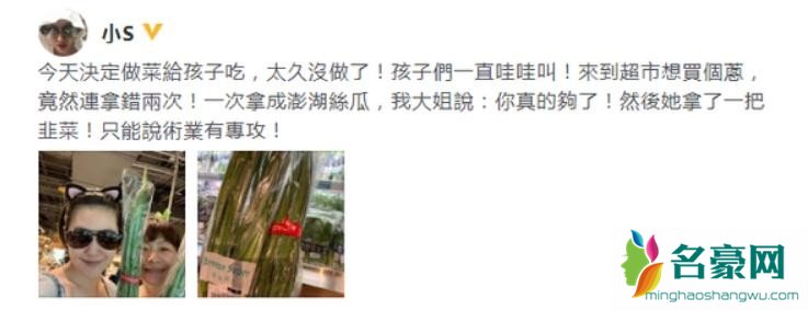 8月22日,小s在微博上晒出了一组在超市买菜的照片,并且配文道:“今天决定做菜给孩子吃,太久没做了!孩子们一直哇哇叫!来到超市想买个葱,竟然连拿错两次!一次拿成澎湖丝瓜,我大姐说:你真的够了!然后她拿了一把韭菜!只能说术业有专攻!?”