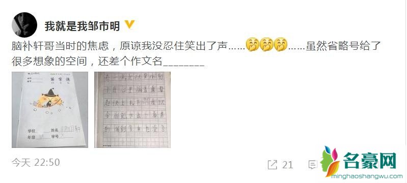 7月7日晚上,邹市明在微博上晒出儿子轩轩的照片,并且配文道:“脑补轩哥当时的焦虑,原谅我没忍住笑出了声……虽然省略号给了很多想象的空间,还差个作文名________”!