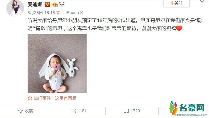 而在8月28日晚上,麦迪娜在微博上回应了“丹尼尔”这个名字,声称:“听说大家给丹尼尔小朋友预定了18年后的C位出道。其实丹尼尔在我们家乡是‘聪明’‘勇敢’的意思,这个寓意也是我们对宝宝的期待。谢谢大家的祝福!”