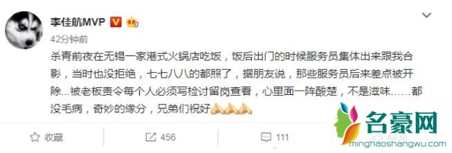 8月26日深夜,李佳航在微博上发文声称在无锡某火锅店内吃完饭的时候,服务员们要求跟自己合影,但是认为这并不会造成什么麻烦,所以就答应了下来,可是这些服务员不仅仅险些被开除,而且还要求写检讨!