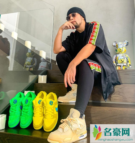 脚上穿着 OFF-WHITE x Air Jordan 4,但照片中最大亮点还是黄色和绿色两双「小熊联名」Grateful Dead x Nike Dunk SB。