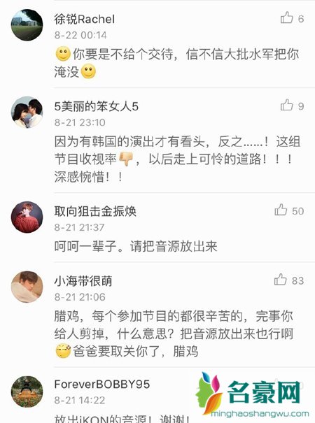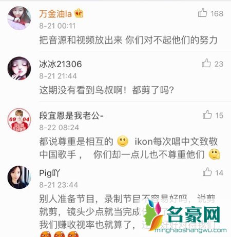 事后,不少粉丝看到节目被剪成这个样子,而在中国待了几个月努力的创作和演唱歌曲的鸟叔和ikon都没有了镜头,辛苦创作的歌曲也没能播出,让他们的粉丝也感到心疼。粉丝们纷纷跑到官微下边留言甚至进行谩骂,希望节目组给ikon鸟叔道歉,虽然限韩令是国家的事情,但是粉丝认为,他们的节目时限韩令下达之前就已经拍摄完成的,不能这么对待他们,就算如此,音源也是属于他们自己的,完全不给表现机会实在是节目组的过错。对此,双方各有各的道理,而我们这些吃瓜群众看到这里最想说的就是,希望世界和平,如果两个国家再次恢复到之前的状态也不会出现这样的事情了。