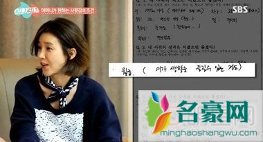 之后,艺人蔡贞安看到母亲写的招婿要求,“希望是大学毕业的男性,工资够享受日常外的生活。职业希望是比较稳定的公务员,房子希望没有贷款。如果是有庭院让小狗跑来跑去玩就好了。不仅如此,声音希望是像韩石圭一样有磁性的低音。”之后便爆笑起来,然后又说道:“看来还要再放下一些啊,母亲。”又引起大家的大笑。