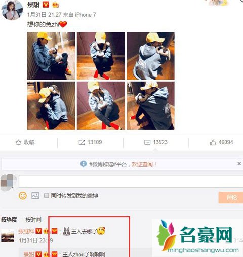上周《王者出击》节目中张继科大方宣布恋情,隔空喊话“T”字小姐,网友们的速度也是不慢,不到一星期就将这位“T”字小姐找到,原来时景甜的“甜”首字母开头,看看网友们找到张继科和景甜是如何互动的吧!1月31日景甜发了一条微博晒出六张与兔子互动的照片,还配文:“想你的兔子”,仿若恋爱中的少女,微博下张继科主动互动,称:“兔子主人去哪了?”景甜回复:“主人走了啊!”