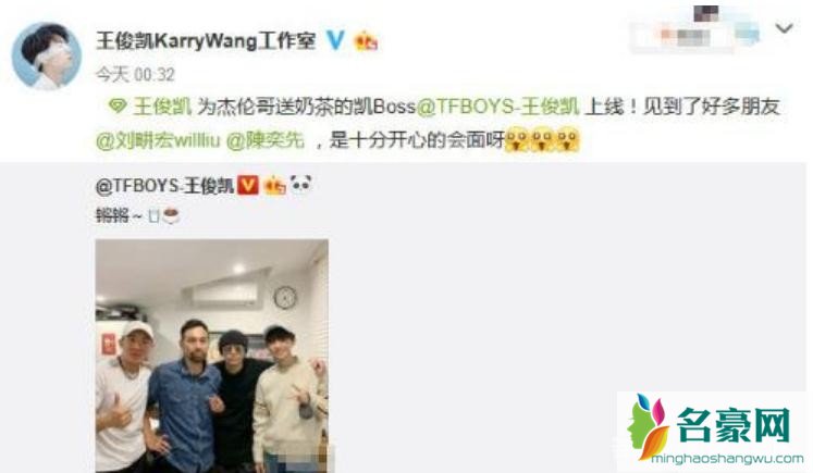 在今天凌晨,王俊凯在微博上晒出了一张和周杰伦刘畊宏陈奕先的合照,并且配文“锵锵”。而且工作室也转发了该微博,并且透露这次王俊凯是为了给周杰伦等人探班。