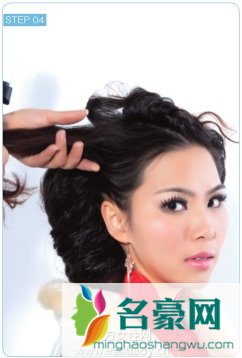 Step 2、将发尾左边的头发由左至右旋转出轮廓弧度,下卡子固定。