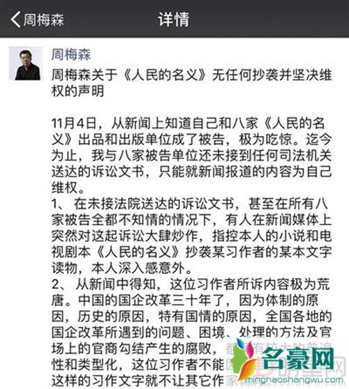 去年作家刘三田起诉周梅森所著《人民的名义》涉嫌抄袭她的作品《暗箱》,要求对方赔偿金额为1800万,并停止电视剧的一切播出、复制、发行、信息网络传播以及小说出版、销售。这条消息刚出来的时候网友们都很震惊,毕竟《人民的名义》可以说是近年来最经典的电视剧了,现在居然被爆抄袭,着实是一件丑闻,但就在昨日周梅森委托《人民的名义》总监制及出品人之一李学政,金杰律师两人主持关于侵权案的答疑会,会上金杰透露周梅森不接受刘三田以这个理由起诉抄袭,当时就发了否认声明,之后通过各种渠道委托我来代理案件。