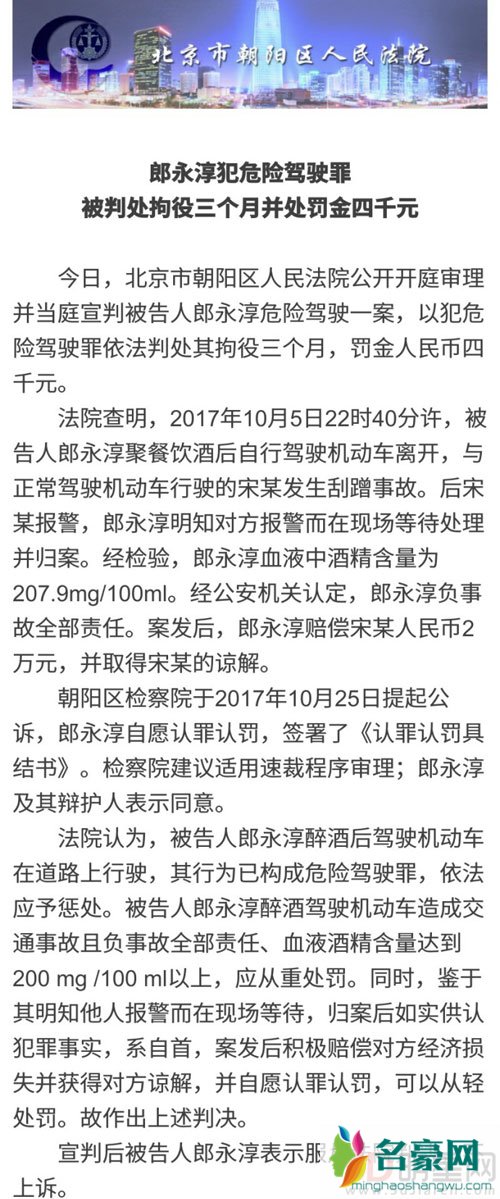 去年10月5日,前中央电视台主持人郎永淳驾驶小型越野客车,在北京市朝阳区西大望路八王坟路口发生交通事故。经交管部门对其进行酒精检测,发现其血液内酒精含量为207.9毫克/100毫升,随后郎永淳因涉嫌危险驾驶罪被北京市公安局朝阳分局依法刑事拘留,后被北京市朝阳区检察院提起公诉。11月3日北京市朝阳人民法院官方微博对郎永淳危险驾驶一案公开宣判结果,被告人郎永淳犯危险驾驶罪被判处拘役三个月,并处罚金四千元,现在更新朋友圈的郎永淳恐怕也是刚被释放没多久吧。