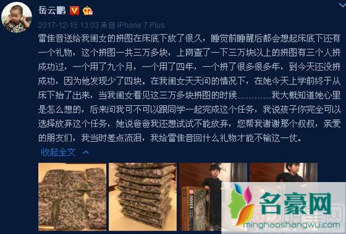 至于为什么岳云鹏会送雷佳音22米长的刺绣,一切还要从雷佳音身上开始说起,早前他接受采访时表示自己到岳云鹏女儿喜欢拼图,所以就买了一个五米多长,几万多块的拼图给送去了,后来岳云鹏还在微博上晒出女儿手拿拼图的画面,并求助网友:“给雷佳音回什么礼物才能不输这一仗。”有网友就在下面给他出主意,说22米清明上河图十字绣就不错,结果小岳岳果然“不负众望”的买了刺绣送给雷佳音,让网友大笑不止,雷佳音这下估计头要更大了。
