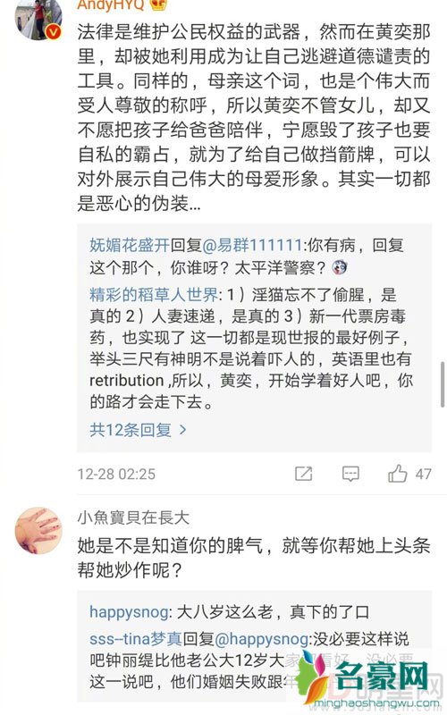 12月27日,黄奕工作室晒出黄奕诉黄毅清侵犯名誉权案胜诉判决书,判决书中要求黄毅清连续7天公开发表致歉声明,赔偿精神损失费10万元,针对这件事情今天凌晨黄毅清发微博回应此事,解释黄奕之所以会胜诉的原因,说因为最近太忙,加上考虑到女儿铛铛,所以后退一步:“不是我为了女儿不想跟你继续闹下去我自己最近也忙得不得了根本没这么多功夫跟你纠缠,所以才决定做为个父亲,我忍了,我也认了,所以才中途突然取消了原本准备许久的上诉计划,你才得以维持原判获得善款的。”