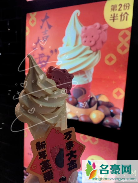 首先从外形上来讲,麦当劳推出的这款糖炒栗子冰淇淋甜筒真的是太可了,整体造型是很符合新年气息的,最上面是奶白色的糖炒栗子口味冰淇淋,在上面还会插上一块红色小牛的曲奇饼干,正好响应了今年牛年的新年氛围,下面是米色的脆筒,吃起来香香脆脆的,和冰淇淋一起吃味道很不错,脆筒外面的包装也是很有创意的,主要是以大红光包装为主,上面还写着“新年美栗,万事大吉”,是比较吉利的。