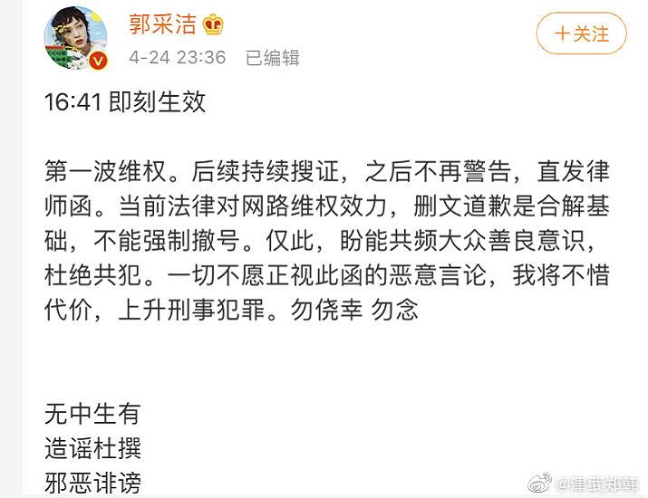在罗志祥与周扬青宣布分手后,有网友爆料称郭采洁与罗志祥有不正当的关系,4月24日,郭采洁在微博发文就此辟谣维权:“无中生有,造谣杜撰,邪恶诽谤,十年笑话,准备开告。”随后,郭采洁又补充道:“即刻生效,第一波维权。后续持续搜证,之后不再警告,直发律师函。当前法律对网路维权效力,删文道歉是合解基础,不能强制撤号。