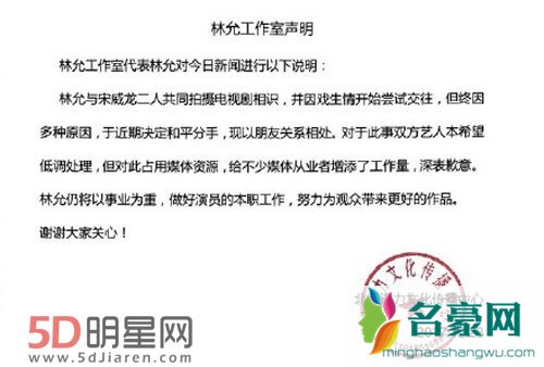 针对网上的爆料记者联系到相关工作人员,对方表示:“我们也在吃瓜,不明白怎么回事。”到下午宋威龙方就发布了声明,称被拍到约会照片中的女生的确是林允,两人在拍摄电视剧《彼岸花》期间因戏生情,后来尝试交往,但因决定以工作为重,所以目前已经回归到朋友关系,而林允工作室也发布了类似的声明,承认二人因多种原因已在近期和平分手,这让吃瓜群众一脸懵逼,没想到刚爆出恋情这就分手了?