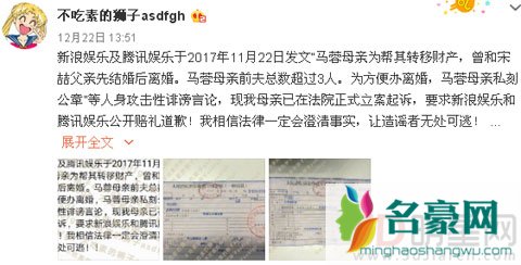 马蓉近日在她原本的微博“金耳朵兔子”中文章,称自己这个账号从2016年8月18日便不能正常登陆账号,直到今天才恢复了使用权,在文中她还表示2016年8月20日的微博不是出自自己,至今还不知道是谁发的。马蓉还称之前关于各种对她家人的攻击已经进行了起诉,在她的新账号“不吃素的狮子”中表明了态度,会对新浪娱乐以及腾讯娱乐起诉,要求他们公开赔礼道歉,澄清事实。