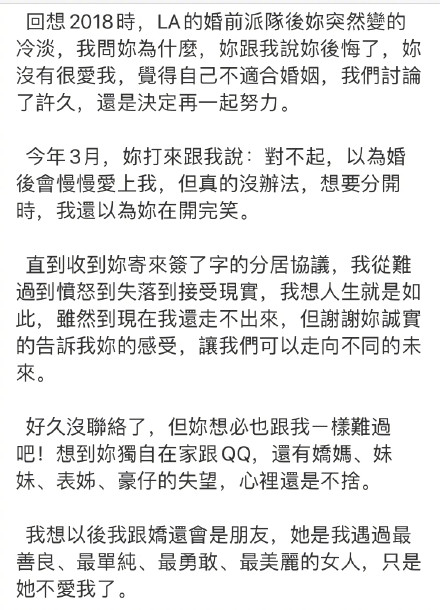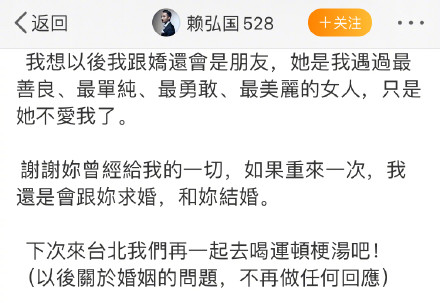 娇跟赖弘国的离婚消息震惊娱乐圈,两人结婚不到两年,之前还看他们频频上节目秀恩爱,现在突然爆出离婚,实在让人不胜唏嘘。赖弘国接受媒体访问表示,离婚理由是“她(阿娇)不再爱我”,并且在今年3月1日已经离婚,男方也在自己微博和IG零零散散地写了一堆长文和粉丝交代清楚,表达了自己的不舍和无奈,从文字看来,是女生想要离婚的。