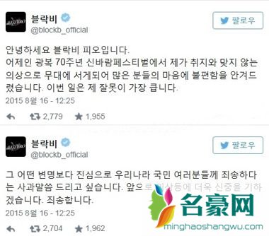 据悉,8月15日在韩国首尔汝矣岛汉江市民公园举行的“光复70周年新风庆典”中,Block B成员P.O在表演《Very Good》和《HER》等热门歌曲时,穿着印有日文“问题ない”(没问题)字样的衬衫,随后该服装在各大社交网站传开,引起韩国网友的不满,并指责了P.O。对此,16日,P.O通过社交网站对自己在“光复70周年新风庆典”上穿了不合时宜的服装进行道歉,并在Seven Seasons娱乐的官方推特下原文写道:“大家好,我是Block B的成员P.O。在昨天的‘光复70周年纪念庆典’上,我表演时穿了不合时宜的服装,让很多人不快。这是我不对。我不想狡辩,只想真心地对各位国民致以真挚的歉意。以后在挑选服装方面会更加慎重的。对不起。”