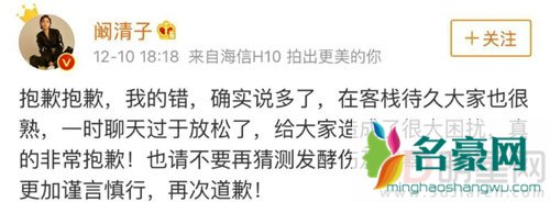 在不死心的网友越来越大之际,baby工作室率先出面辟谣,阚清子也终于意识到自己为baby惹了麻烦,于是在微博上发文致歉,希望大家不要在猜测发酵伤及无辜,自己以后一定谨言慎行,对此baby大方留言,回复她说应该由造谣者出来道歉。其实阚清子的道歉也挺没意思的,有网友就表示:“不知道她道歉是几个意思?如果她说的是真的,她向谁道歉?如果仅仅是网友自己揣测他人,她又道哪门子歉?”