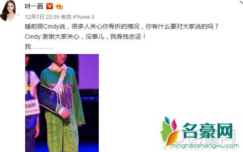 在森碟骨折一事被大家热议到热搜上后,12月7日叶一茜在微博上发了一条自己与骨折后的森碟对话,透露爱女受伤的情况,微博上写道:“睡前跟Cindy说,很多人关心你骨折的情况,你有什么要对大家说的吗?Cindy:谢谢大家关心,没事儿,我身残志坚!我:……”在这条微博下面还配了一张森碟穿着绿色青蛙装的衣服,手臂用布带挂在脖子上的照片,照片上面带微笑的森碟似乎并不介意自己的伤情,一脸活力十足的样子。