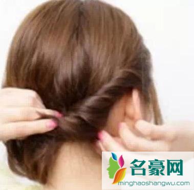 将全部刘海向后放扭转,一边扭转一边沿着弧度抓取旁边的头发。