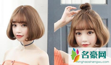 许多人以为波波头太过单调,其实这种想法是片面的。图中模特成功展示了如何把波波头变得更时尚,波波头+发微卷烫+空气刘海+丸子头的造型,不是很可爱活泼吗?