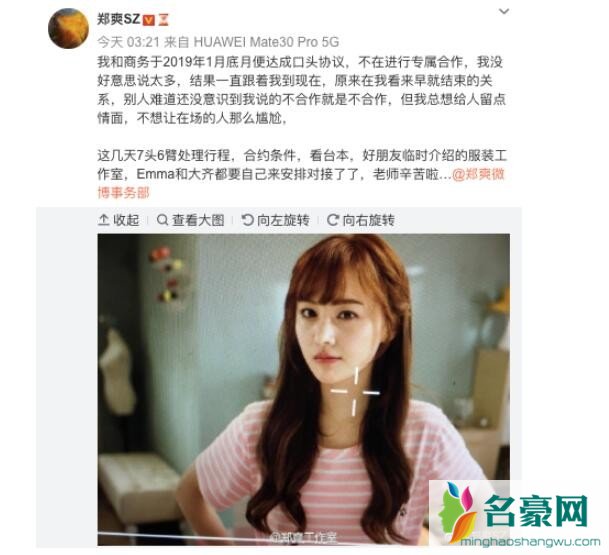 6月2日凌晨,郑爽在社交平台上更新了动态,郑爽发文表示自己于2019年1月底与商务在口头上达成了结束专属合约的协议,但是对方一直没有意识到,还仍然跟着自己。郑爽称这段关系在她看来是早就结束的关系,只不过她还想给对方六点情面,不想让在场的人那么尴尬。