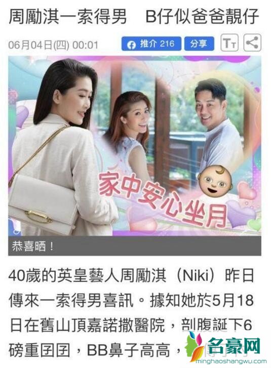 近日,网上曝出了一则关于41岁周励淇剖腹产子的消息,据媒体报道,周丽淇在5月18日于旧山顶嘉诺撒医院,剖腹诞下6磅(约5.4斤)重的儿子,小婴儿十分健康,长得像父亲傅浤鸣(傅程鹏)。