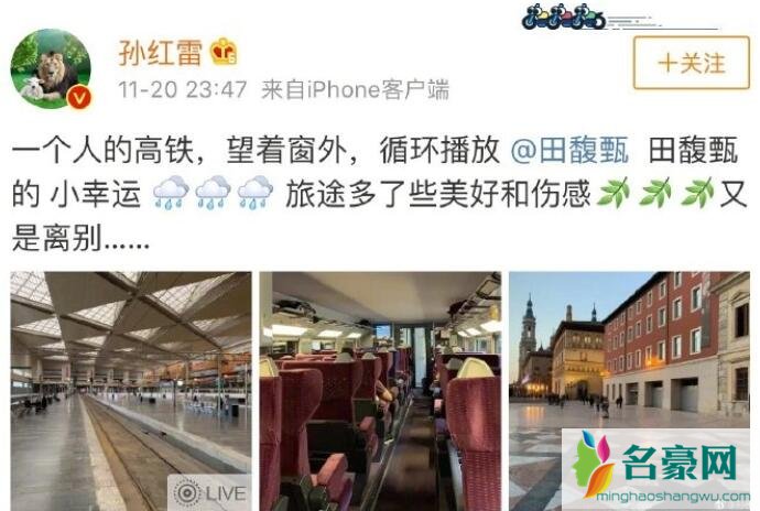 孙红雷发文说出自己的感想,后来艾特田馥甄,结果圈错人,网友们看到后都笑傻了。孙红雷晒出一组旅途中的照片,而配文比较伤感,“一个人的高铁,望着窗外,循环播放田馥甄 的 小幸运,旅途多了些美好和伤感,又是离别……”。