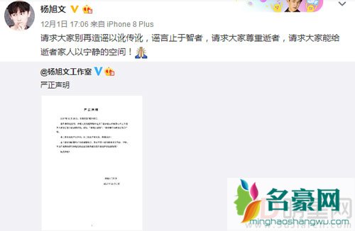 事件沸沸扬扬这么久,昨天杨旭文工作室终于发布声明辟谣,否认网传的“涉毒”、“与任娇身亡事件有关”等一系列传言,称“以上信息严重失实,均属谣言”,表示他们将保留代杨旭文依法追究相关谣言发布者法律责任的权利。随后沉默许久的杨旭文本人也转发这条声明,并留言称:“请求大家别再造谣以讹传讹,谣言止于智者,请求大家尊重逝者,请求大家能给逝者家人以宁静的空间!”