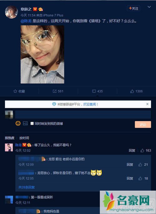 11月21日,章龄之在微博上晒图调侃老公陈龙,她配文说:“陈龙,是这样的,这两天开始,你就别看《猎场》了,好不好?么么么。”同时还晒出一张自己的自拍照,照片上带着眼镜的章龄之某个角度真的格外像吴昕,因此好多网友都在评论区下面留言表示:“第一眼看成了吴昕”、“这个角度真的好像吴昕啊”,更有人特意把她和吴昕的照片放在一起作对比,没想到她们俩相似度这么高。