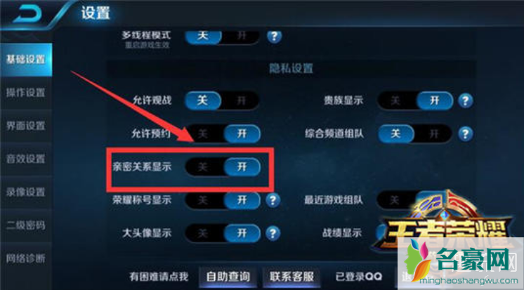 设置的话,我们可以打开王者荣耀的设置,左侧菜单里的第一个页面,就有亲密关系的隐藏的按钮,你点击关闭就可以了,同理的还有观战模式和战绩页面的隐藏。