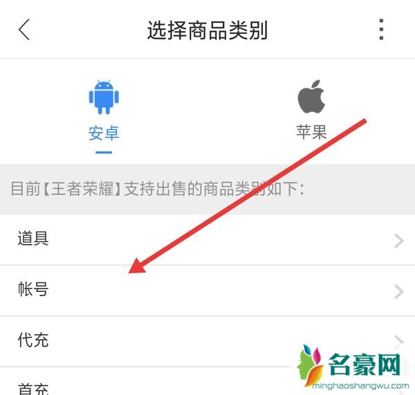 5、在出售商品的类别里面,选择账号,点击进去。