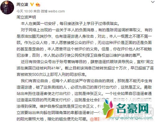 在周立波被捕后第二天,他就缴纳了保释金在妻子与律师的陪同下离开,后来又因涉嫌“非法持有枪支和毒品”在美国纽约州拿骚县地区法院接受传讯,3月9日法院开庭审理此案,现在传出周立波被判41年的消息,相信的网友其实并不是很多,而周立波也在第一时间进行辟谣,“截止目前该消息已被转发超过十万次,早已超越了谣言被转发500次以上即可入刑的司法标准。”并发布律师函要“向躲在阴暗角落的卑鄙造谣者讨一个说法。”
