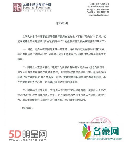 今年周立波因涉毒涉枪在长岛被捕,缴纳过保释金被放出来后他就一直深陷舆论的压力,尤其是最近还有消息称周立波涉毒涉枪案已经公开宣判结果,周立波被判了41年,此消息引起多方网友关注,但实际上这条消息真的属实吗?不久后周立波本人发微博发律师函开始辟谣。