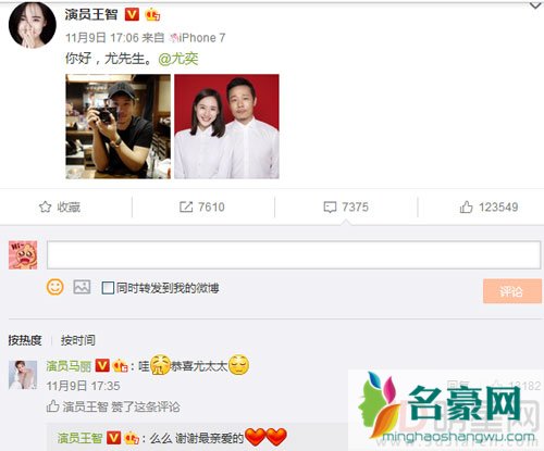 得知王智结婚消息后,有记者向相关工作人员进行求证,对方表示二人已经在昨日领证结婚,目前尚未有婚宴计划,而在王智与老公尤奕发的微博中,他们俩分别晒出结婚照以及对方视角下的爱人照,甜蜜的称呼对方:“你好,尤先生/太太”,下面好多网友都在祝福二人,同时在《夏特洛烦恼》、《羞羞的铁拳》等作品中与王智有过合作的马丽、沈腾、尹正等人也都纷纷留言祝幸福。据悉王智的老公尤奕是活跃在国内时尚界的一线商业摄影师,担任了新奕映像CEO的职位。