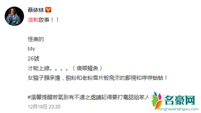 12月19日,蔡依林发文道歉登上了热搜,很多人奇怪她到底因为什么道歉?而且还上了热搜,更是开玩笑道自己是女骗子,表示愿意承担脱粉和老粉的鄙视。之后还和粉丝们调侃,如果你气到有不适之处记得打电话给家人告知您身在何处。