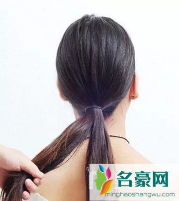 第二步:然后将散开的中长直发聚集在脑后发际线上方一点的位置,用梳子梳理光滑后,用一根细细的皮筋扎成低低的马尾辫,将马尾辫分成均等的两份。如图所示。