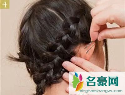 第四步:左侧的发辫按照同样的方式进行编发,发梢部分使用小皮筋固定后将两条发辫交叉放置,使用黑色的小发夹做固定。