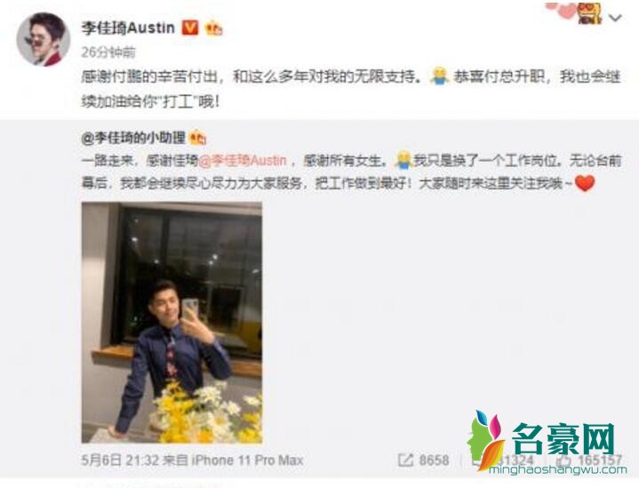 小助理的动态发布出来以后,随后李佳琦也转发了此动态,李佳琦发文表示:“感谢付鹏的辛苦付出,和这么多年对我的无限支持。恭喜付总升职,我也会继续加油给你“打工”哦!”