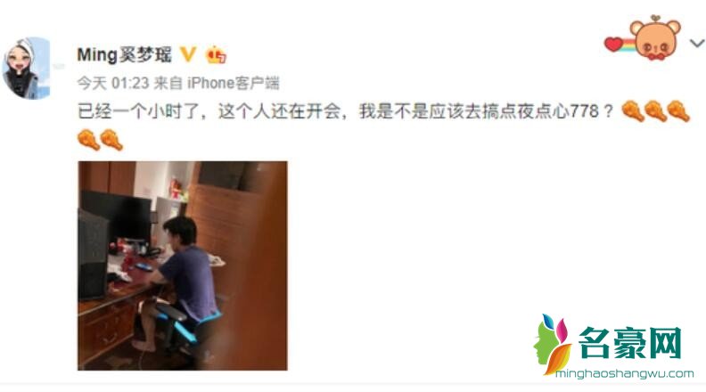 虽然奚梦瑶吐槽何猷君太爱工作了,只记得电话会不记得520,但字里行间却又满是甜蜜和幸福。凌晨1点多,何猷君仍在开会,奚梦瑶偷偷拍了一张老公的背影并晒出,再次“抱怨”他实在太爱工作了。