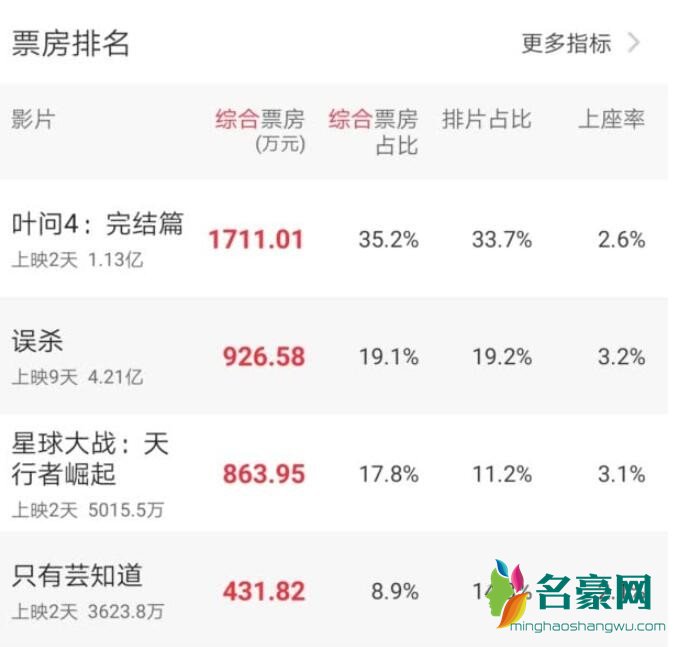 这期同档电影除了《叶问4》以外,还有冯小刚的《只有芸知道》,星战系列《星球大战:天行者崛起》,开心麻花的《半个喜剧》等强劲对手,如今《叶问4》成为同档期冠军,将其它几部影片远远甩在了身后。