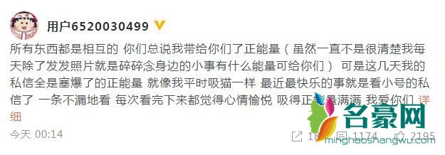 就像我平时吸猫一样,最近最快乐的事就是看小号的私信了,一条不漏地看,每次看完下来都觉得心情愉悦,吸得正能量满满。我爱你们。怎么一到晚上就变这么感性真是。”