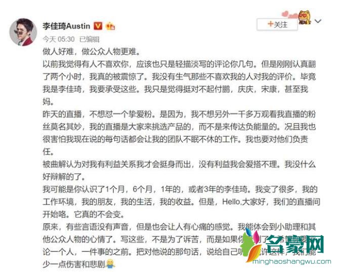 近日,李佳琦在社交平台上更新了一条动态,李佳琦发文回应了直播怼粉一事,李佳琦发文感慨:“做人好难,做公众人物更难”。他在文中坦言小助手以及母亲都曾因自己被某些网友“问候”,更害怕自己在直播中的“怼”粉丝,为团队招来更多的非议。