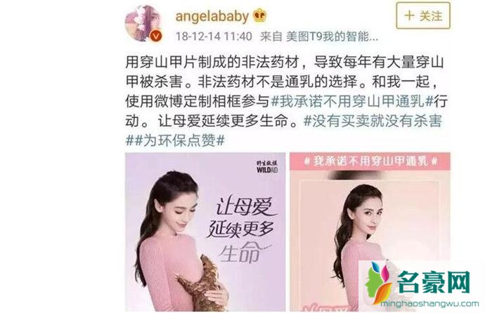 据悉杨颖在去年12月份拍摄了一部关于保护穿山甲的宣传片,在宣传片中杨颖如抱婴儿一般抱着一只穿山甲,广告语则是:用穿山甲片制成的非法药材,导致每年有大量穿山甲被杀害。非法药材不是通乳的选择。和我一起,使用微博定制相框参与我承诺不用穿山甲通乳行动。 让母爱延续更多生命,没有买卖就没有杀害为环保点赞。”