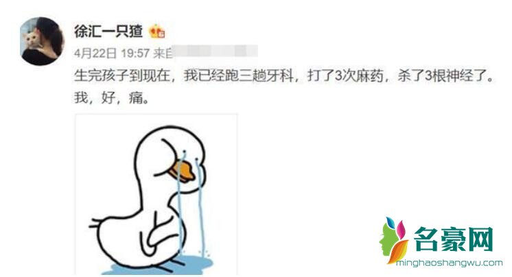 近日,papi酱在社交平台上更新了动态,papi酱发文透露了自己的近况,她表示自己产后已经去了3次牙科,打了3次麻药,杀了3根神经,并配了一张流泪的鸭子的表情包来表达自己的心情。