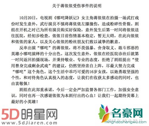 10月23日,《哪咤降妖记》剧组官微发布蒋依依在拍摄期间受伤的说明,说明中表示女主角蒋依依在拍摄一场武打戏时发生意外,武行演员不慎把蒋依依撞伤,造成她左膝粉碎性骨裂,经过初步检查后蒋依依的伤情已经基本稳定,暂无大碍,而她本人也在就医后重回剧组继续进行后续的拍摄工作。随后蒋依依在微博上也更新动态晒出两张穿着高领毛衣,面带微笑的照片,配文称:“我很好,别担心。”