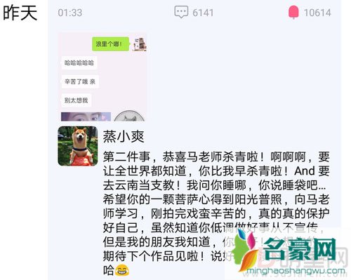 10月18日凌晨,郑爽在雪糕群上面恭喜马天宇杀青,据悉马天宇和郑爽一同合作了电视剧《悲伤逆流成河》昨天刚好个人杀青,郑爽就发文恭喜:“恭喜马老师杀青啦!啊啊啊,要让全世界都知道,你比我早杀青啦!”只不过在文中她还透露了一个重要的讯息,那就是马天宇要去云南支教啦,郑爽说:“向马老师学习,刚拍完戏蛮辛苦的,真的真的保护好自己,虽然知道你低调做好事从不宣传,但是我的朋友我知道。”