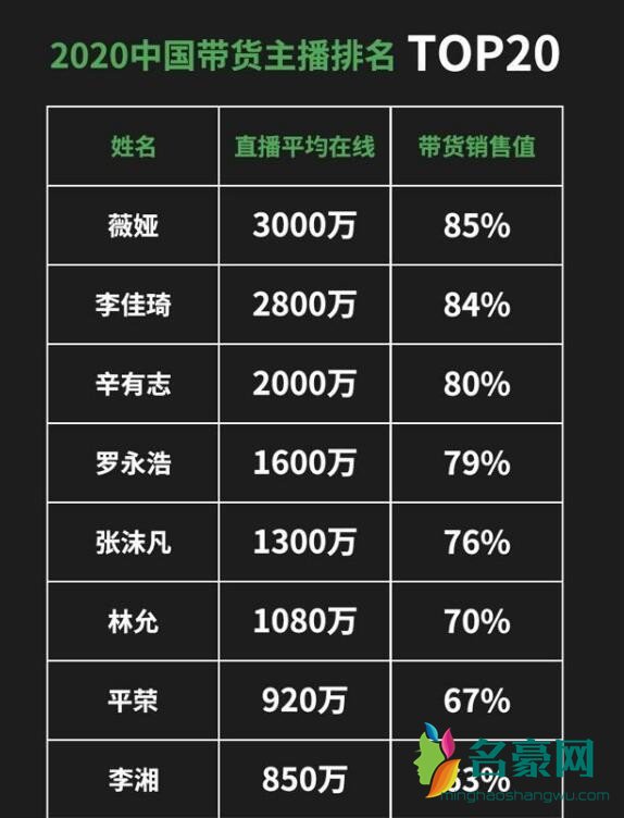 众所周知李佳琦和薇娅的实力是非常强的,不出所料的是,明星与网红带货表现各领风骚,薇娅、李佳琦稳居冠亚军,张沫凡第5位,林允、李湘、徐冬冬均入top10,罗永浩初入直播即杀进前四,势头同样不容小觑。