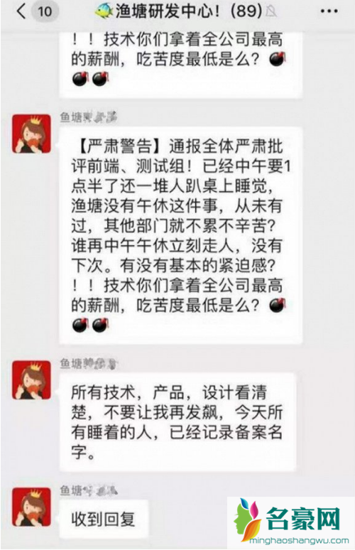 近日,有网友爆料渔塘科技公司内部通知禁止员工午休。从曝光的内部聊天截图来看,疑似公司管理人员在群内发飙:“通报全体严肃批评前端、测试组!已经中午要1点半了还一堆人趴桌上睡觉,渔塘没有午休这件事,从未有过,其他部门就不累不辛苦?谁再中午午休立刻走人,没有下次。有没有基本的紧迫感?!!技术你们拿着全公司最高的薪酬,吃苦度最低是么? ”